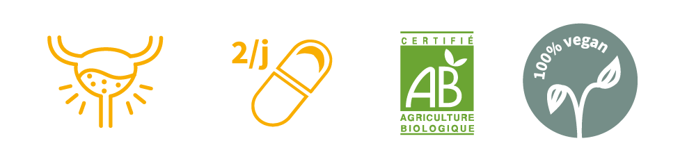 Prendre 2 gélules par jour avec un grand verre d’eau au cours des repas.